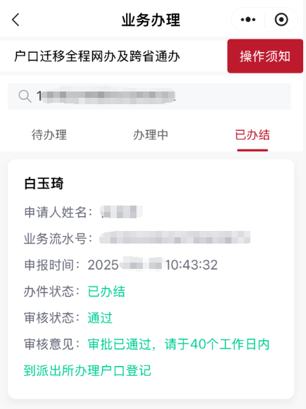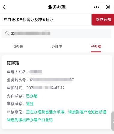 登录“京通”中“已办结”,截图后打印(登录“京通”→ 搜索“工作调动进京户口准迁手续办理” → “户口迁移全程网办及跨省通办” →“已办结”;截图示例图如下)截图并打印。