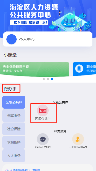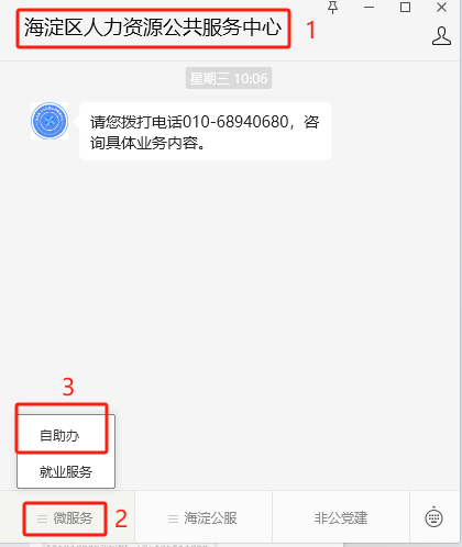 1.关注“海淀区人力资源公共服务中心”公众号,点击“微服务-自助办”